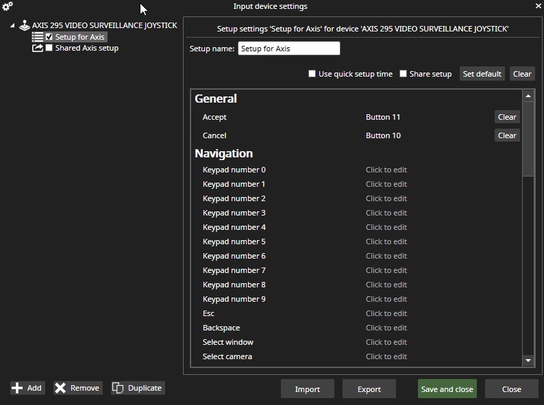 Default input device setups are disassembled to folder C:\Users\<WindowsUser>\AppData\Roaming\DVMS\DVR Application\DefaultPTZConfig. When the "Default" button is clicked, the default setup from the folder is read, and its config is loaded to UI. The default setup format is the same as when importing and exporting device setups.
