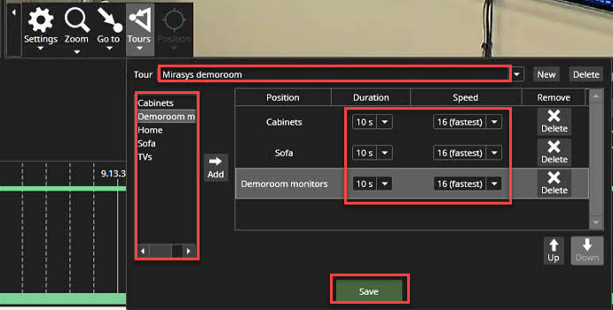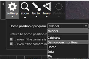 The PTZ settings menu contains iris and focuses slider controls and editing the camera home position.The home position can be selected from the currently saved presets or tours.It is also possible to define how long the camera takes until it returns to the home position and if the switch to the home position is made only if it is not in some other tour or preset position.