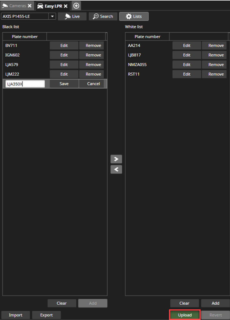 With the upload, the user can upload created black & white lists to the camera