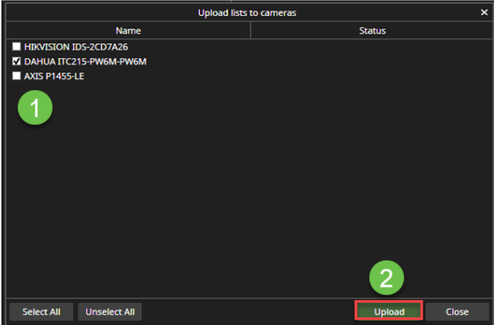Select cameras, where lists are uploaded