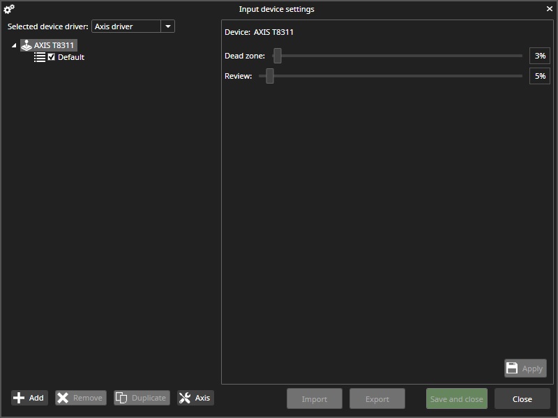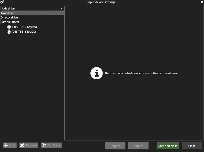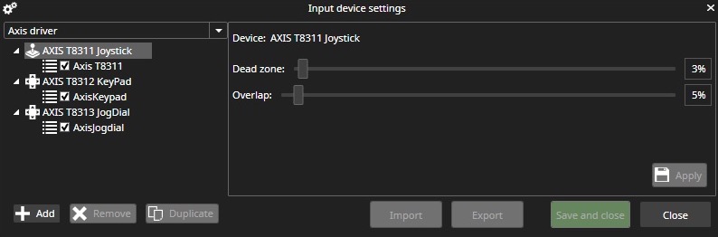 Axis device driver supports AXIS T8311 Joystick, AXIS T8312 Keypad, and AXIS T8313 Jogdial.