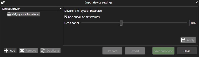 VM Desktop default setup for DirectX devices and AXIS joystick