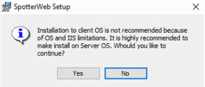 When installing SpotterWeb to client OS, the installer will give a warning about the OS/IIS limitations.