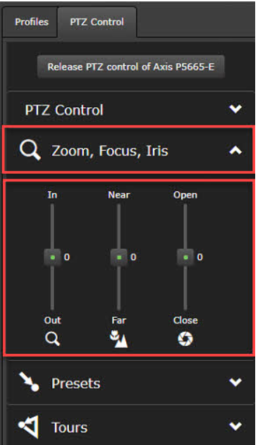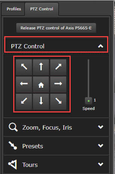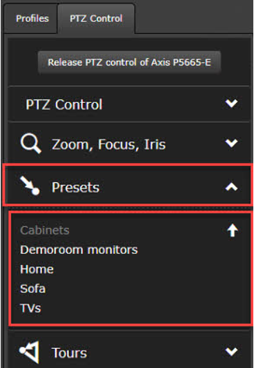 The user can control PTZ camera presets. The current preset is shown with the arrow icon end of the preset name