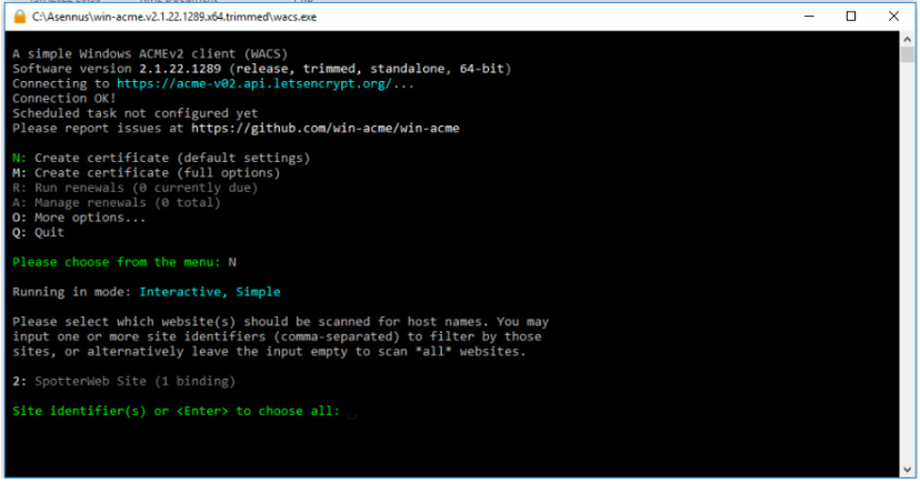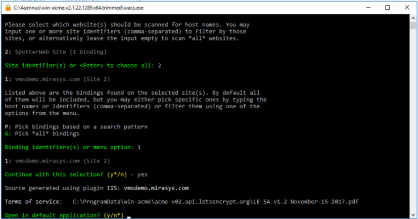 13. Kun tämä on tehty, työkalu luo sertifikaatti tälle verkkotunnukselle. Nyt voit sulkea työkalun kirjoittamalla Q ja painamalla ENTER.