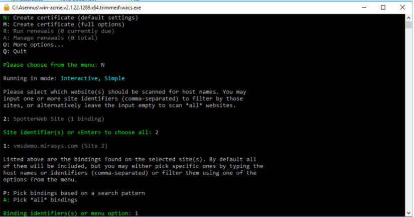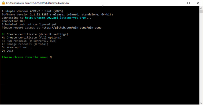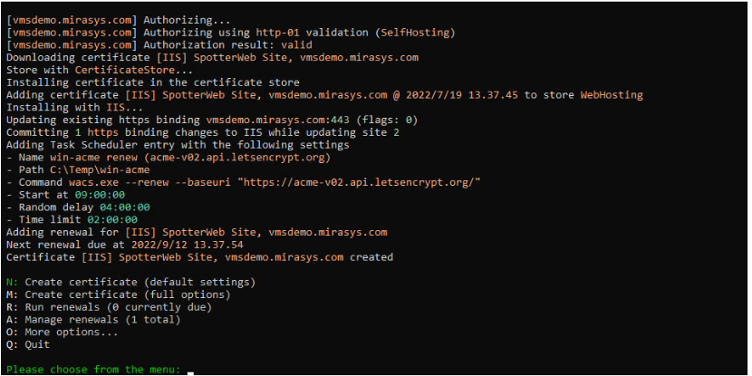 13. Kun tämä on tehty, työkalu luo sertifikaatti tälle verkkotunnukselle. Nyt voit sulkea työkalun kirjoittamalla Q ja painamalla ENTER.