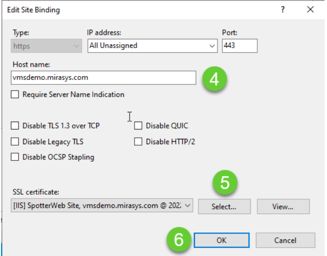 5. Valitse Select ja etsi Let´s encryprillä tehty sertifikaatti